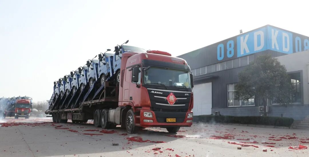 环保科技发车场上,30余辆新能源环卫车整齐列队,驶出厂门奔赴全国市场。同时,2条生产线全面启动,近100辆新能源环卫车的订单正在全力赶制,将陆续发出。